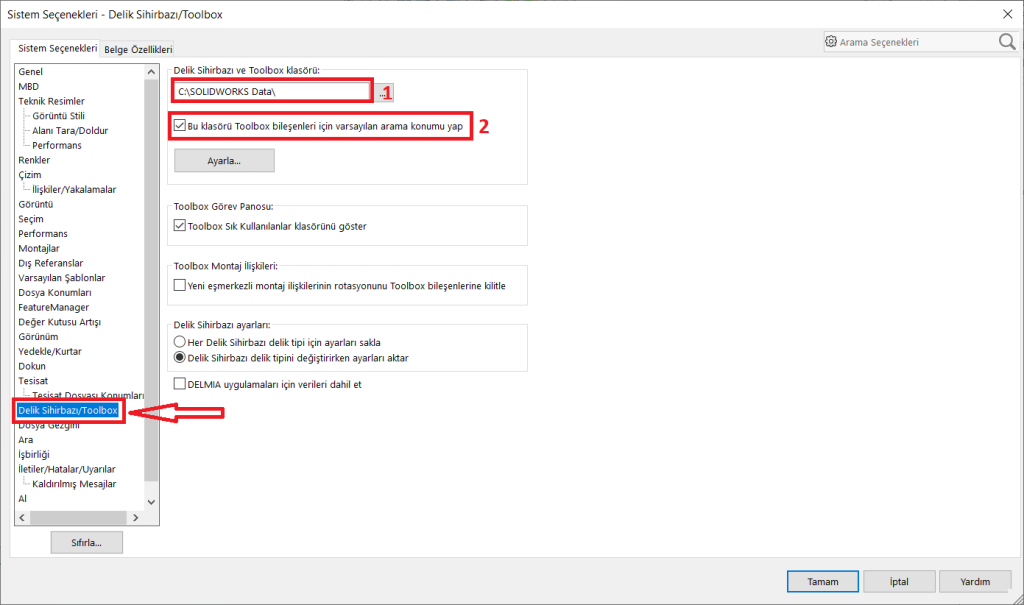Bu referans yönetimi aşağıdaki şekilde gerçekleşir: SOLIDWORKS sistem ayarları içerisinde Delik Sihirbazı/Toolbox bölümünde, aşağıdaki resimde 1 numara ile gösterilen konumda, tüm Toolbox dosyaları ve veri tabanı saklanır. SOLIDWORKS, varsayılan olarak Toolbox bileşenlerini bu alanda oluşturur ve bu konumdan montajlarınıza eklenen parçalara referans verir. Ayrıca 2 numaralı kısımda gösterilen;