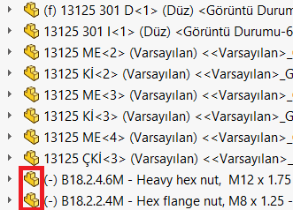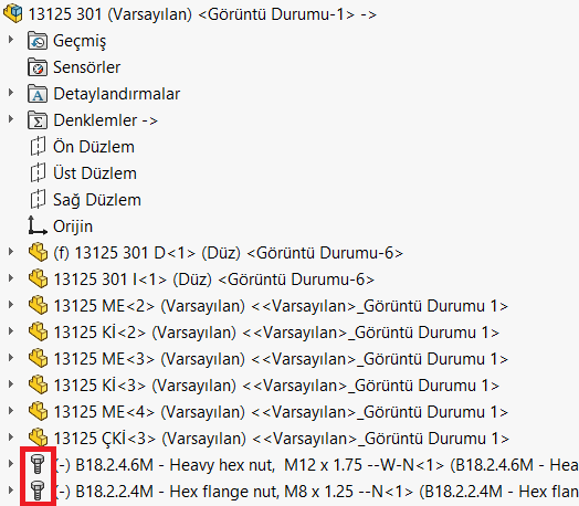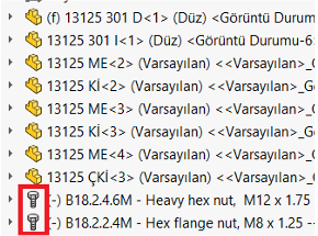 SOLIDWORKS Toolbox içerisindeki parçalar, montajlarınızda kullanıldığında özel bir işaret ile işaretlenir.