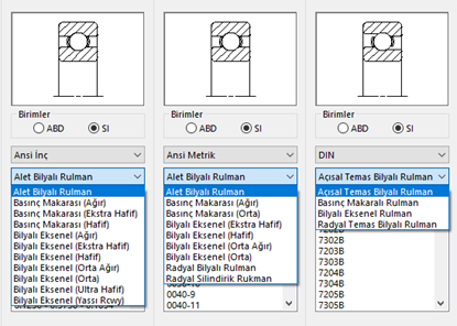 Sol taraftan başlarsak en üstte rulmana ait kesit bulunur. Hemen altında birim seçme bölümü mevcuttur. Buradan Amerikan ve SI birimleri arasında geçiş yapabilirsiniz. Birim seçiminin altında standart seçimi ve rulman tipi seçimi mevcuttur. Standart ve rulman tipi seçildikten sonra uygun boyut seçme ekranından uygun olan rulman seçilir.