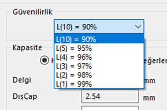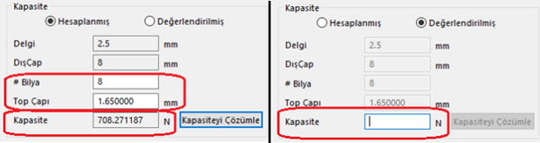 Hemen altında kapasite bölümü mevcuttur. Bu bölümün hemen başında iki seçenek vardır, bunlar sırasıyla “hesaplanmış” ve “değerlendirilmiş” seçenekleridir. Hesaplanmış seçeneği ile standart veya makara/top sayısı ve çapı özelleştirilmiş rulmanlar için kapasite hesaplanabilmektedir. Değerlendirilmiş tarafında ise kapasite değeri deneye veya varsayıma bağlı olarak elle girilir.