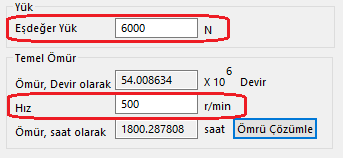 Yük bölümünde “Eşdeğer Yük” girilir ve buna bağlı olarak devir cinsinden ömür değeri hesaplanır. Rulmanlarda saat cinsinden belirlenen ömür, rulmanların ömür takibi ve değişimi açısından daha geçerlidir; dönüş hızına bağlı olarak saat cinsinden de hesaplama bu komut aracılığı ile yapılabilmektedir.