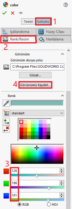 https://rgb.to/ral/page/1 internet sitesindeki RAL kodlarına karşılık gelen RGB kodlarını SOLIDWORKS’teki Görünümü Düzenle simgesine tıklayıp, renk kodu kısmına girdiğimizde RAL renkleri oluşturulur.