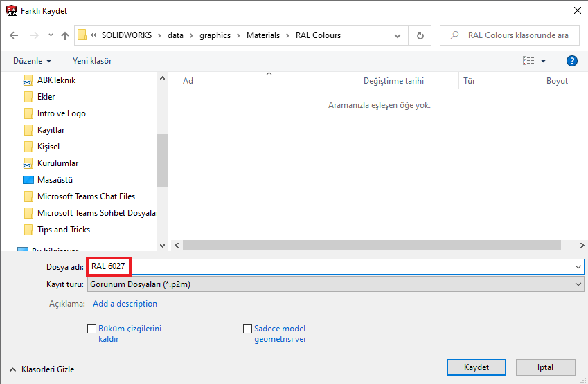 Görünümü Kaydet dediğimizde görünüm dosyalarının olduğu klasör açılır. Buraya, oluşturduğumuz RAL renklerini kaydetmek için bir klasör açmalıyız. Oluşturduğumuz renkleri de bu klasöre kaydetmeliyiz.