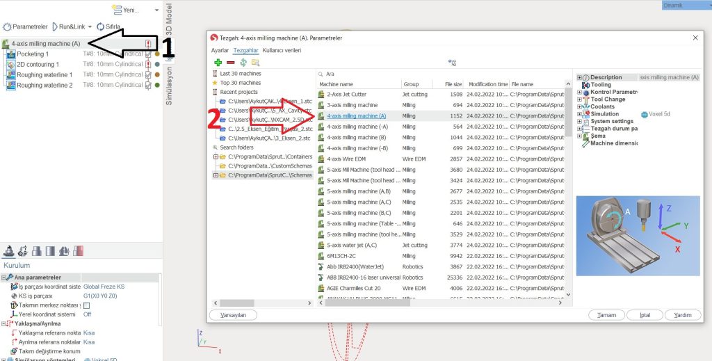 SprutCAM’de 4 eksen işleme yapmak için yapacağınız ilk işlem resimde gösterilen makine kısmından 4 eksenli bir makine çağırmak olacaktır. Bunun için görselde bulunan işlem sıralamasını takip edebilirsiniz.