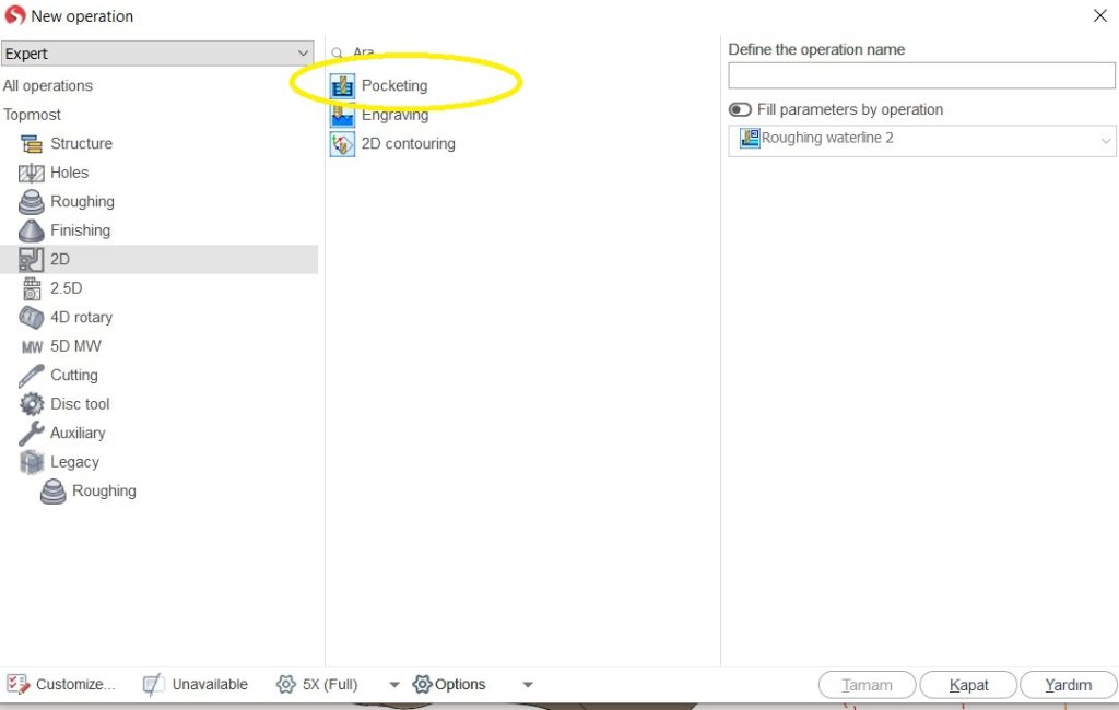 Artık parçamıza uygulanacak operasyonlara geçebiliriz. Yapacağımız ilk operasyon Pocketing operasyonudur. New operation sayfasından 2d sekmesinin içerisinde yer almaktadır. Operasyonumuzu seçtikten sonra özelleştirmelerini yapabiliriz. Dikkat edilmesi gereken nokta iş tayini sekmesinde Taban, Üst Seviye, Alt seviye ve çıkıntı ekle komutlarının parça üzerinde düzgün belirtilmesidir. Taban olarak işlenecek cep’in alt yüzeyi, Üst seviye olarak parçamısın üst kısmı alt seviye ise yine işlenecek olan cep’in tabanı ve çıkıntı olarakta cep’imizin alt kenarları seçilerek iş tayini oluşturulur.