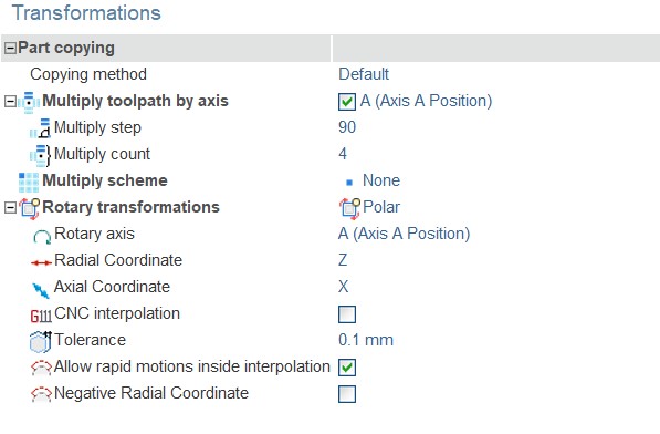 Kurulum, İş tayini ve Takım sekmelerinden ayarlamalarımızı yaptıktan sonra Transformations sekmesinden yaptığımız işlemleri aynalayabiliriz. Multipy toolpath Axis aynalamanın hangi eksende gerçekleştirileceğini, Multiply Step kaç derecelik açı ile bu aynalamanın dağıtalacağını Multiply count ise kaç adet aynalama değeri olacağını girdiniz komutlardır.