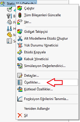 Çözüm uyarlamalı ağ iyileştirme yöntemleri, doğrusal statik etüt ağacının üst kısmındaki etüt adına sağ tıklanarak erişilebilen bir lineer statiğin etüt özellikleri diyaloğundan etkinleştirilebilir.