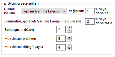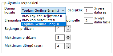 Elemanları, göreceli Gerilme Enerjisi ile güncelle _% veya daha fazla koşulu, her bir öğenin gerinim enerjisinde izin verilen maksimum bağıl hatayı ayarlar. Diğer iki durdurma kriterinden hiçbiri karşılanmazsa, program gerinim enerjisi _% veya daha fazla olan elemanların polinom sırasını artıracaktır.