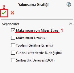 Bu grafik, çözüm döngülerinin sayısına karşı farklı özniteliklerin çizilmesine izin verir. Hedef doğruluğu, maksimum von Mises gerilimi, maksimum bileşke yer değiştirme, toplam gerinim enerjisi ve düğüm sayısı çizilebilir.