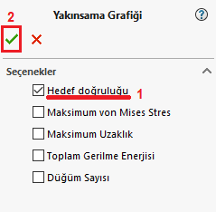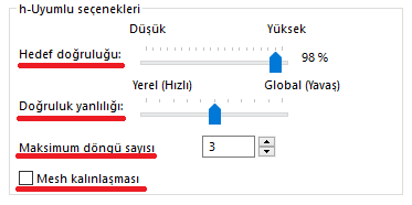 Hedef doğruluğu kaydırma çubuğu, çözüm için istenen hatayı ayarlar. %98’lik varsayılan değer, modeldeki gerinim enerjisi norm hatası %2’den az olduğunda çözümün duracağını belirtir. Bu kaydırma çubuğu %99 ‘a ayarlanabilir.