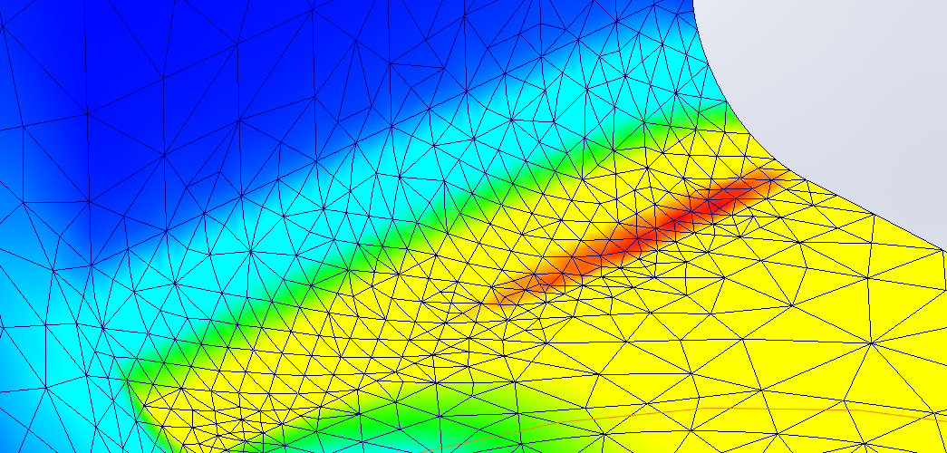 Aşağıdaki görüntü, ağ bindirilmiş bir gerilim grafiğini göstermektedir. Çözücü, yüksek gerinim değerlerinin olduğu konumlara algılar daha sonra meshi(ağı) tam olarak ihtiyaç duyulan yerlere uyarlar.