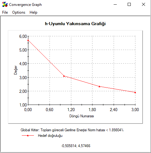 Yakınsama grafiği döngü 0’da (ilk döngü) başlar. Aşağıdaki h-adaptif yakınsama grafiği, çözümün 4 döngüde %2 ‘den daha az olan hedef doğruluğuna ulaştığını göstermektedir.